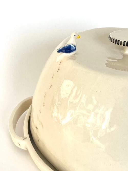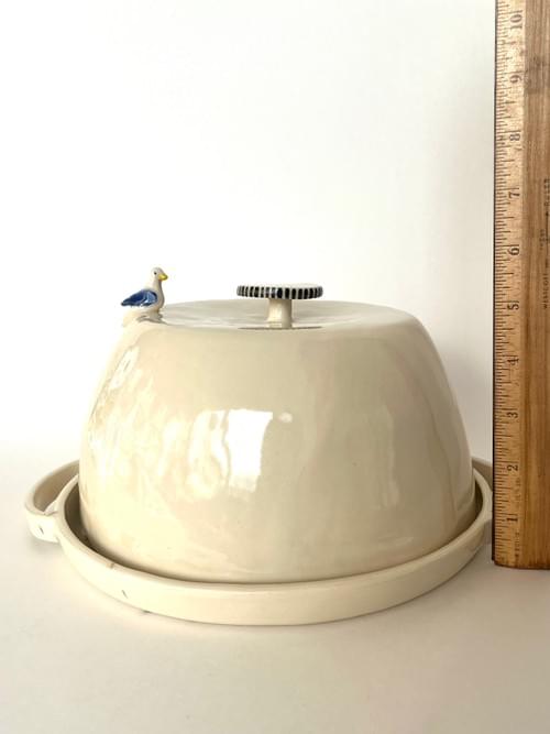 The whimsical hand built ceramic stoneware is perfect to display and store bread, cookies, cakes, and crumbs. A friendly pigeon has climbed up to the top and is patiently waiting for a taste of whatever is inside.